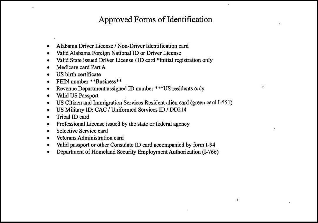 - Valid driver’s license or State Issued ID for EACH REGISTERED OWNER, pursuant to Section 32-7A-17, Code of Alabama 1975. Other forms of ID may include, but are not limited to: (for complete list, see above)